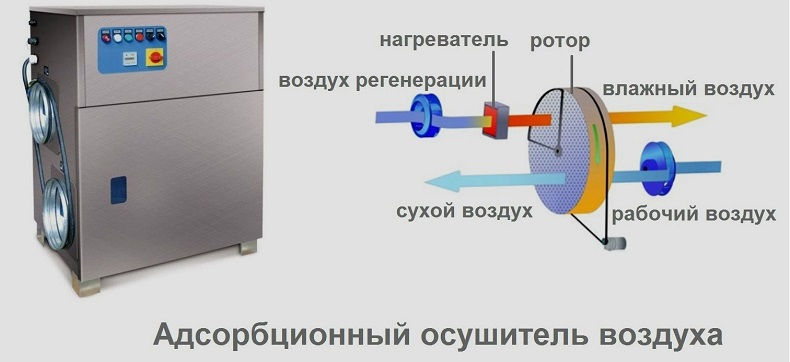 Принцип действия первого вида осушителя заключается в пропускании воздуха через вещества, с которыми химически взаимодействует водяной пар. Но использование абсорбентов ограничено, так как их восстановление невозможно, и они и непригодны для повторного применения.